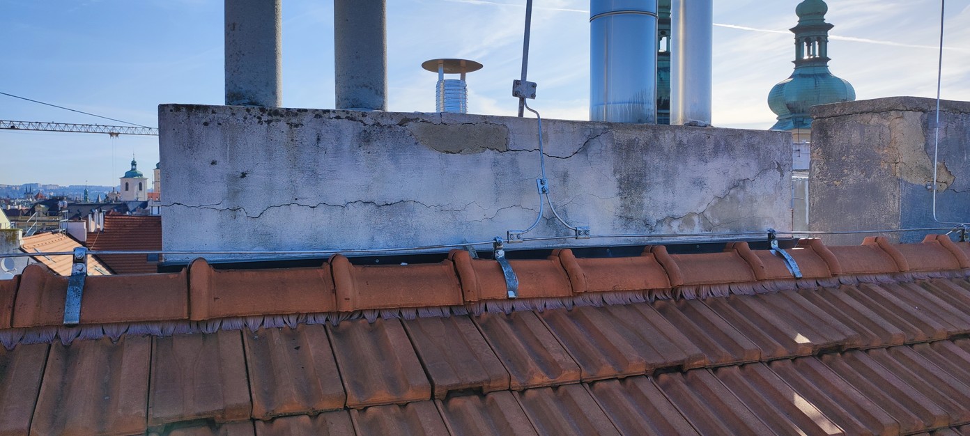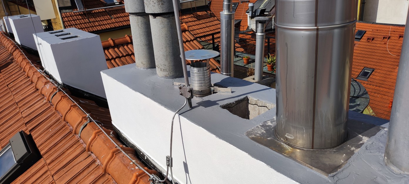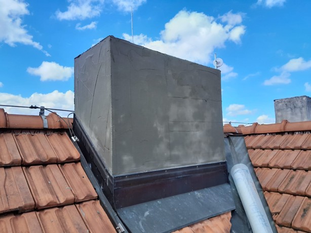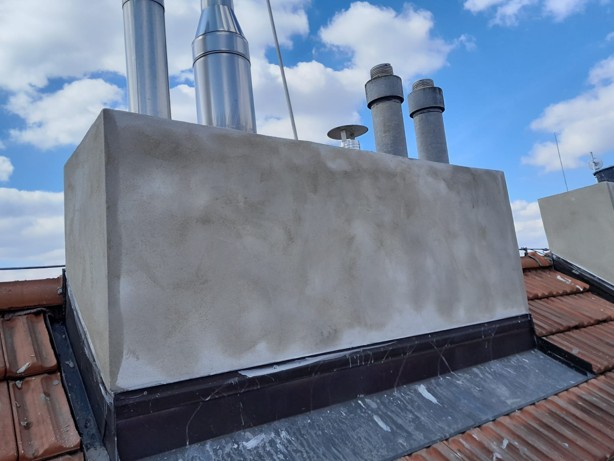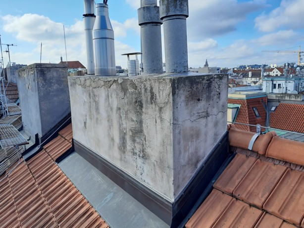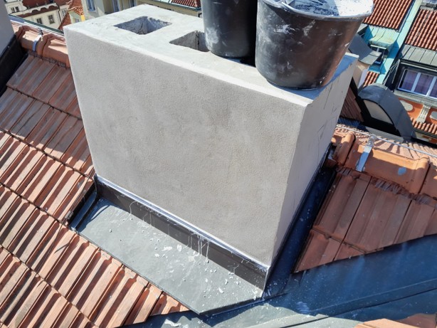 Opravy komínů patří k poměrně zanedbávaným záležitostem při správě celého domu, neboť nejsou často tak na očích. Každopádně opadávající omítka z komínu může při pádu na chodník způsobit stejná zranění či škody jako při odpadnutí z římsy. Dalším problémem může být v extrému i narušení statiky komínu, který je pak nutné přeskládat. V našem případě šlo ale o včasnou údržbu. Nejprve jsme odstranili volné části a vše řádně zpenetrovali. Poté již došlo na samotné vyspravení vnější části komínu, vystěrkování a vyztužení perlinkou, vyštukování a nátěr silikonovou barvou. Kvůli zabránění pronikání vody byla vrchní strana komínů natřena izolační barvou na beton s ochranou proti UV záření.